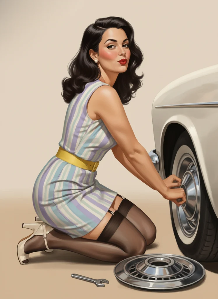Portret caricatură pin-up cu tematică auto, poziție lângă roată de mașină și estetică pin-up mid-20th-century
