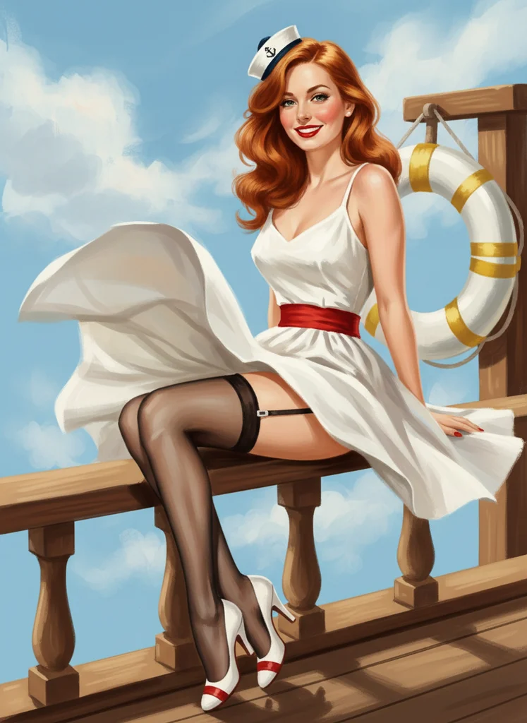 Portret caricatură pin-up nautical în stil ilustrație comercială clasică mid-20th-century cu tematică maritimă și estetică pin-up