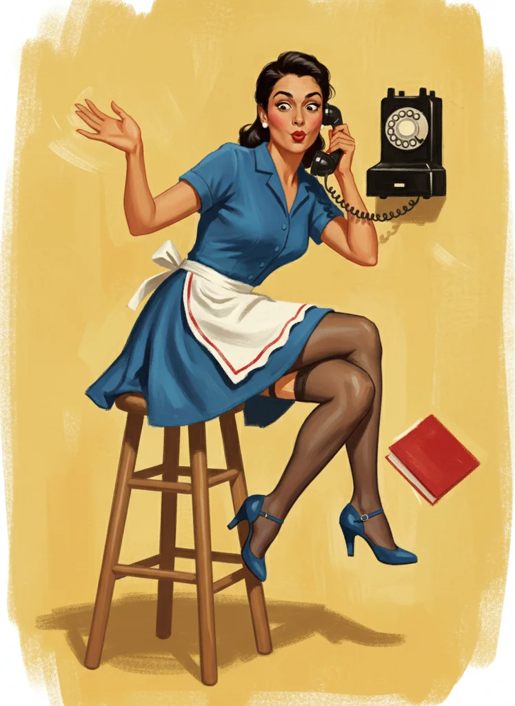 Portret caricatură pin-up cu telefon, scaun de lemn și estetică pin-up mid-20th-century cu brushwork vizibil