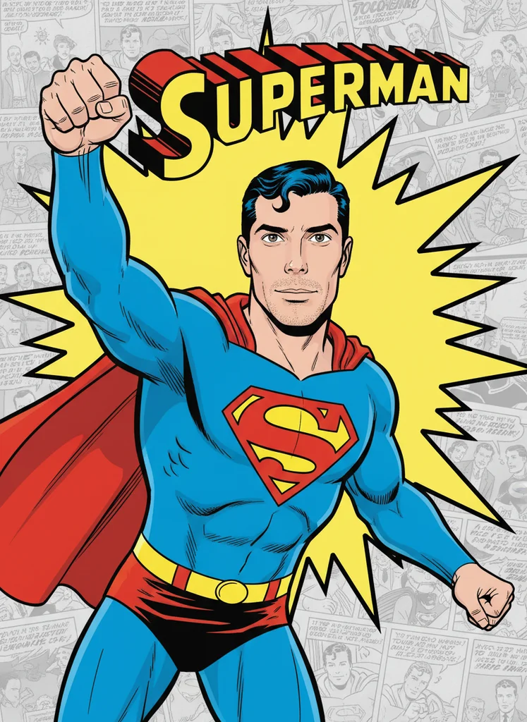 Portret caricatură Superman în stil benzi desenate vintage cu culori saturate, contururi groase și compoziție clasică