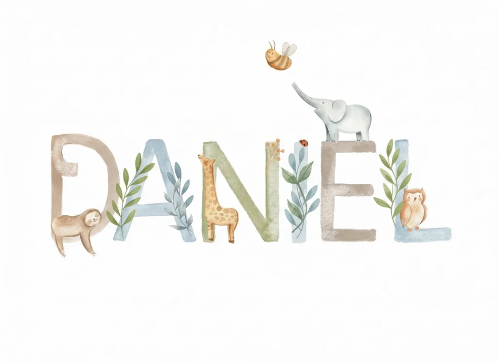 Ilustrație decorativă cu nume personalizat în stil acuarelă și gouache, cu elemente jucăușe integrate