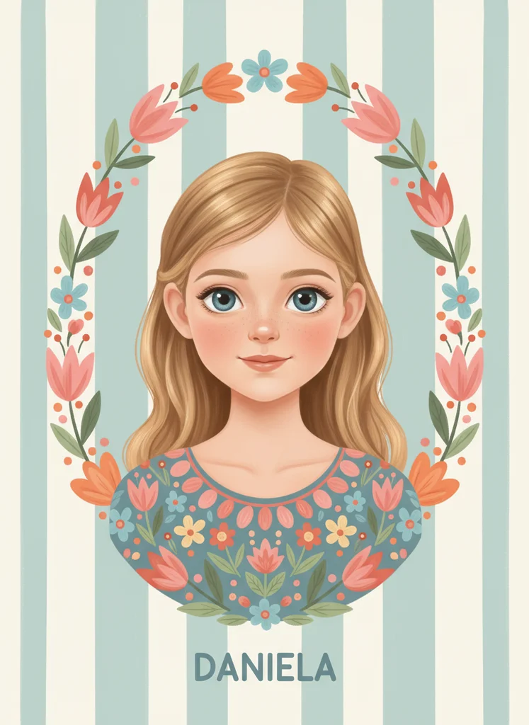 Portret ilustrat de înaltă calitate pentru tablouri personalizate pentru copii, cu cunună florală și fundal crem cu dungi subtile