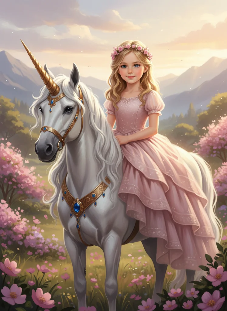 Portret ilustrat fantasy cu copil pe unicorn, rochie de basm, cunună florală și peisaj fermecat.