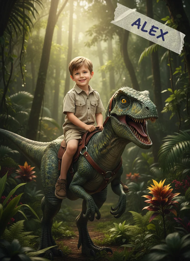 Portret copil călare pe un dinozaur velociraptor realist într-o junglă tropicală - personalizare text