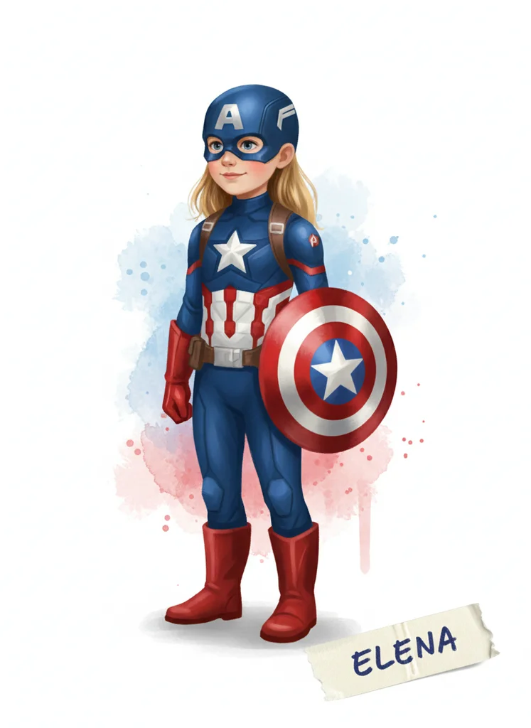 Portret copil ca supererou Captain America în stil pictural blând și jucăuș