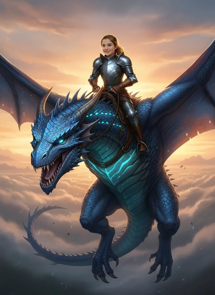 Scenă high-fantasy cinematică cu copil călare pe dragon albastru în zbor deasupra norilor la apus, stil concept art de blockbuster.