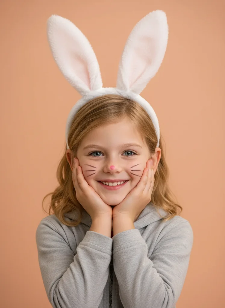 Portret copil cu accesorii de iepure, păstrând hainele originale și adăugând urechi și face paint