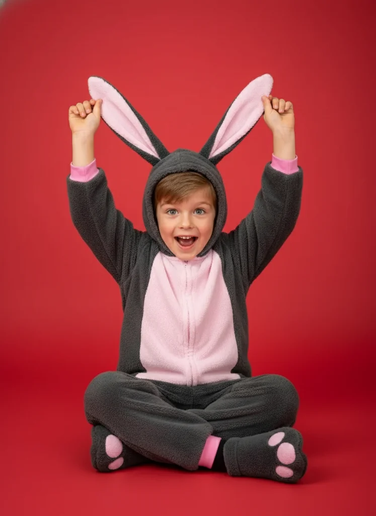 Portret copil cu costum de iepure, păstrând costumul original și poziția specifică