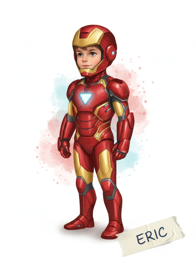 Portret copil ca supererou Iron Man în stil pictural blând și jucăuș