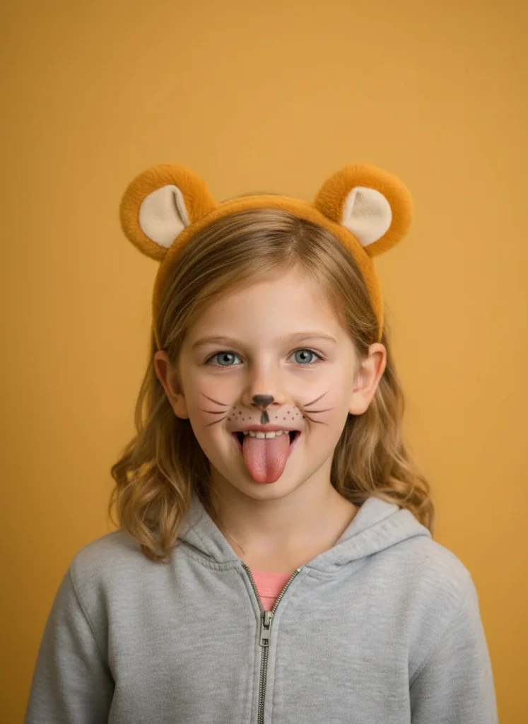 Portret copil cu costum de leu, păstrând hainele originale și adăugând accesorii de leu