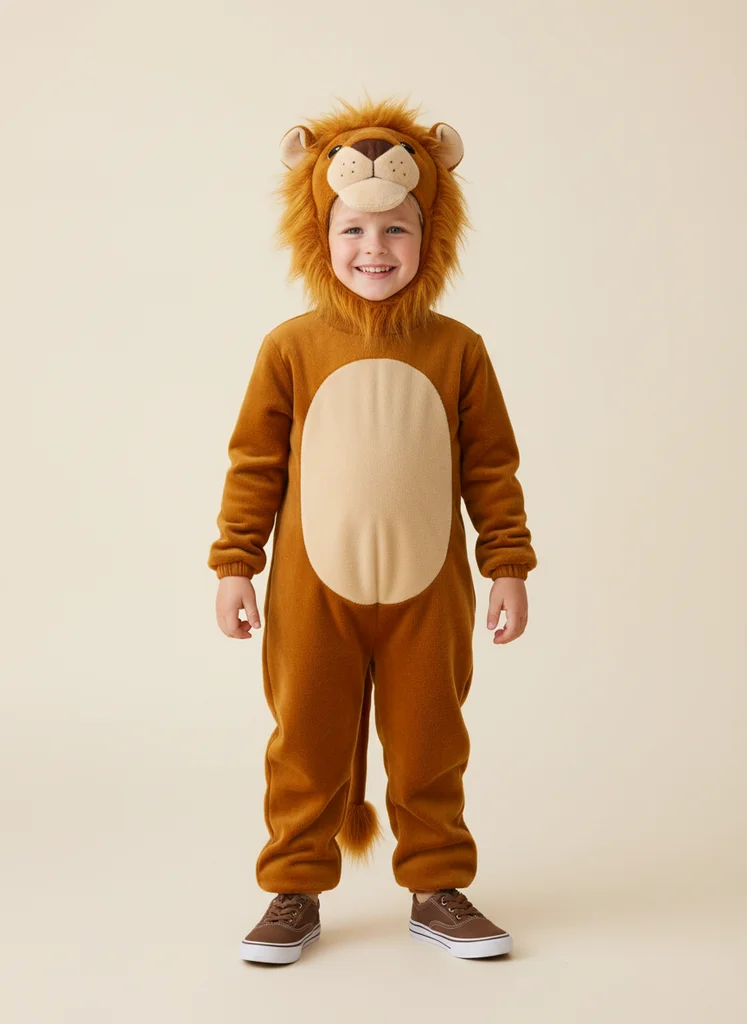 Portret full-body copil cu costum de leu, păstrând costumul original și poziție naturală