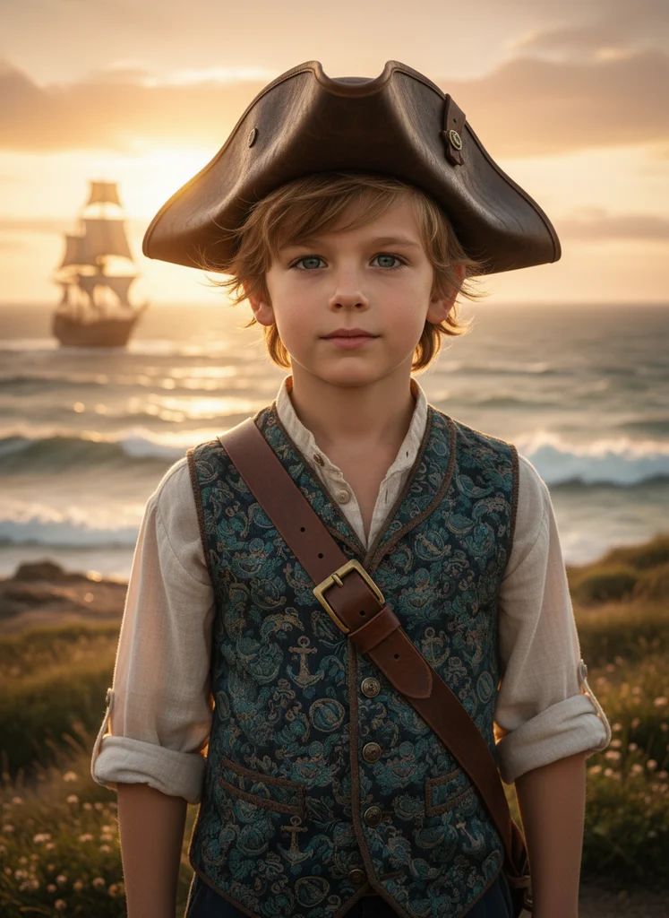 Portret cinematic de înaltă calitate cu copil ca legendă maritimă pe stâncă litorală la golden hour, stil premium fantasy film