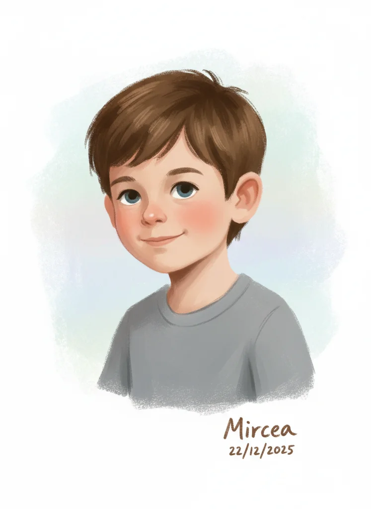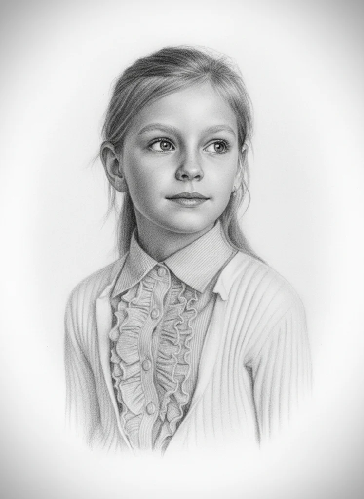 Transformare fotografie copil în portret clasic grafit cu compoziție fixă 3/4, gaze în sus, fundal alb, grayscale strict