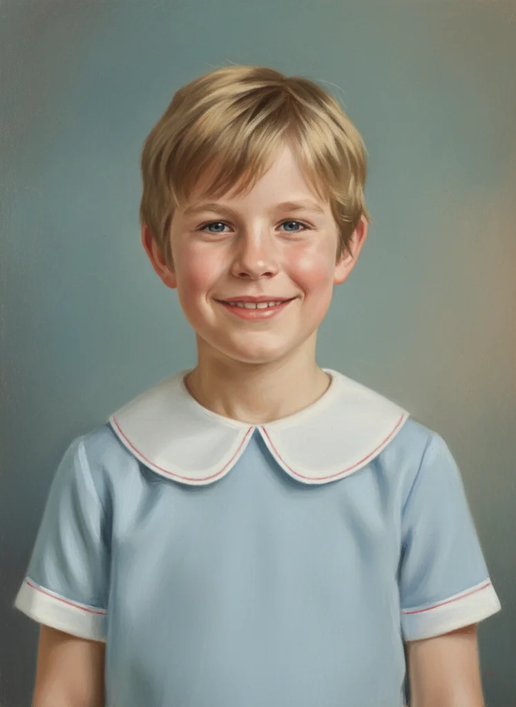 Transformare fotografie copil în portret clasic pictat în pastel moale, compoziție frontală fixă, guler Peter Pan albastru pastel, stil vintage studio.