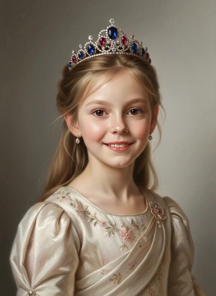 Portret luxury storybook cu copil ca moștenitor regal, tiara cu pietre prețioase și rochie de mătase, stil pictură în ulei clasică