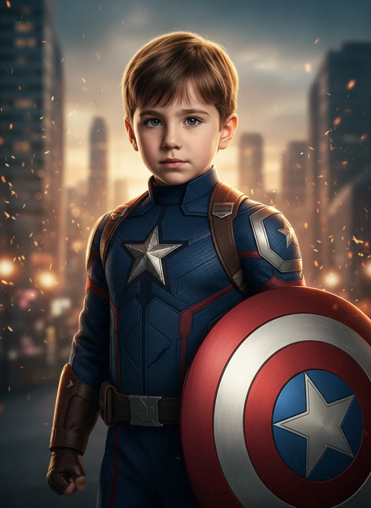 Portret cinematic superhero de copil cu costum patriotic inspirat, stil dramatic cu fundal urban blurat și iluminare cinematică