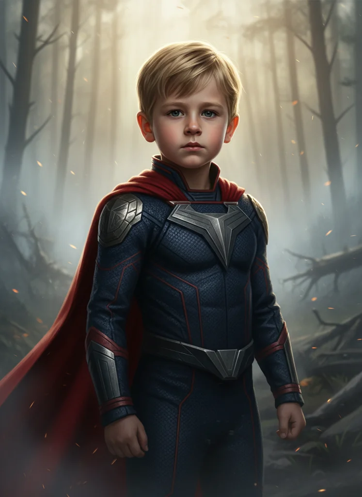 Portret cinematic dark fantasy superhero de copil cu costum întunecat, capă roșie și fundal forestier atmosferic, stil dramatic