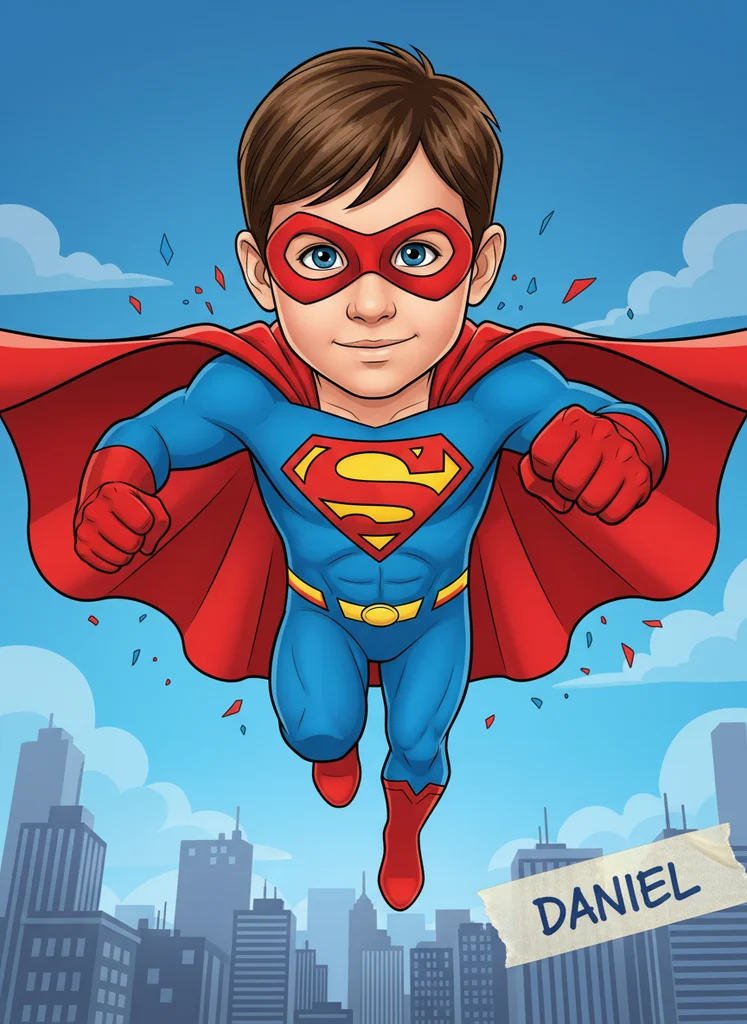 Portret copil ca supererou Superman în stil ilustrativ modern