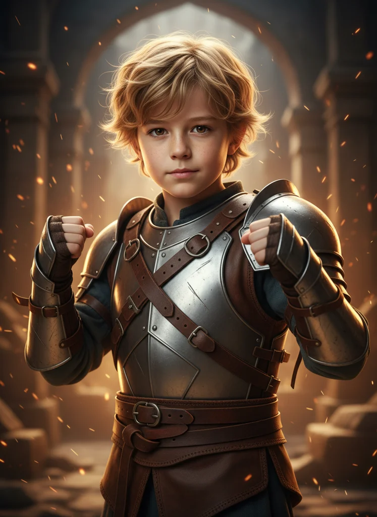 Portret epic fantasy warrior cu copil ca guardian, armură originală cu bracere metalice forjate și fundal de piatră antică cu emberi